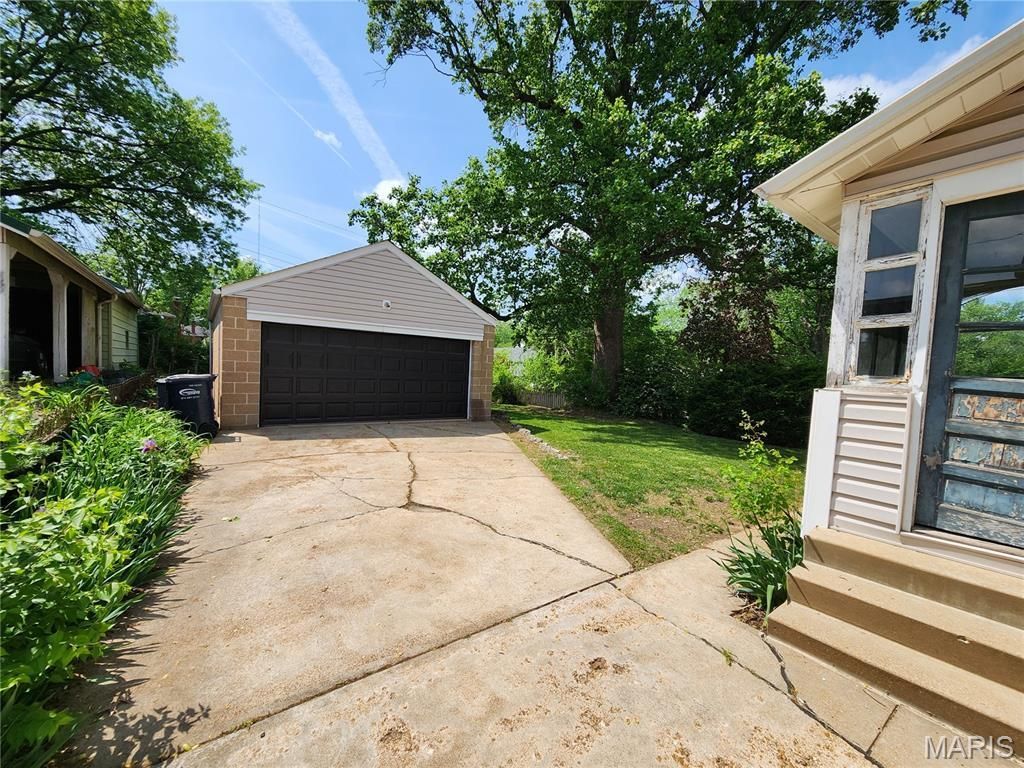 1.5 story in the heart of Shrewsbury! This home has so much potential and has been well loved. Enter from the front covered front porch in to the large open and separate living and dining rooms with hardwood floors, decorative fireplace, extra tall ceilings and plantation shutters. The kitchen is large and a blank canvas with white cabinetry, vinyl floor, pantry and lots of natural light. The french door leads you to the enclosed back porch that needs a little love. There is a neutral and white full bath on the main level along with the carpeted master bedroom. Upstairs, there are three dormer bedrooms and ample closet space. The walk out basement is unfinished with plenty of storage. The backyard is level and partially fenced. An oversized 2 car detached garage completes this property. This home is ready for some cosmetic updates and personal touches. Close to I44, the metrolink, downtown old orchard/webster and neighborhood parks. Roof was replaced in 2025. Refrigerator, washer and dryer stay.